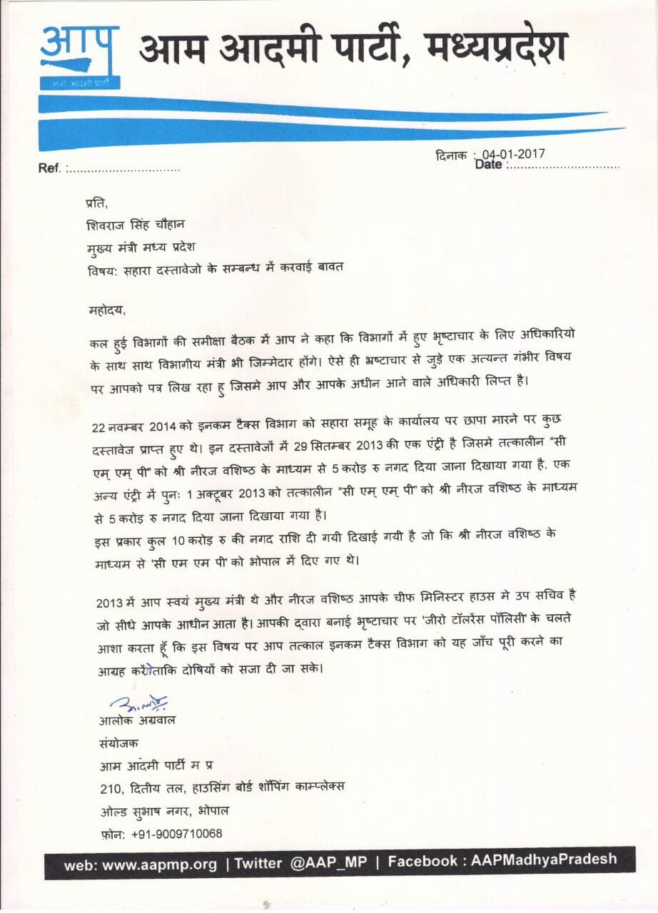 विज्ञत दिनों विभागों की समीक्षा बैठक मुख्य मंत्री शिवराज सिंह चौहान ने कहा है कि विभागों में हुए भृष्टाचार के लिए अधिकारियों के साथ साथ विभागीय मंत्री भी जिम्मेदार होंगे। इस मुद्दे पर आम आदमी पार्टी प्रदेश संयोजक श्री आलोक अग्रवाल ने मुख्य मंत्री शिवराज सिंह चौहान को पत्र लिखकर सहारा दस्तावेजों के सम्बन्ध में करवाई की मांग की है।