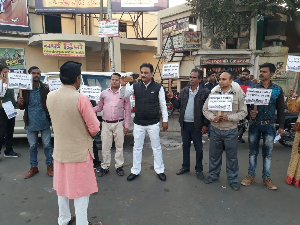 झाँसी नगर के भारतीय प्रजशक्ति पार्टी ने भगवंतपुरा में संचालित हो रही पशु वधशाला के विरोध में इलाइट चौराहे पर शांतिपूर्वक हाथों में तख्तियां लेकर प्रदर्शन किया।