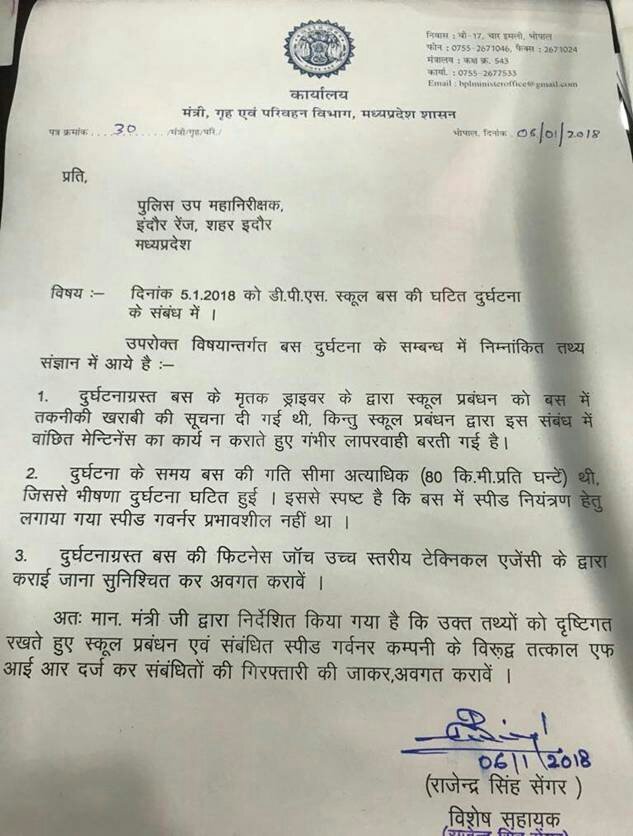 डीआईजी इंदौर को आज शनिवार को लिखे पत्र में गृहमंत्री ने कहा है कि एक्सीडेंट हुई बस के ड्राइवर ने स्कूल प्रबंधन से बस में आई तकनीकी खराबी सुधरवाने के लिए कई बार कहा था, मगर स्कूल प्रबंधन ने ड्राइवर की बात को नजरअंदाज किया। इस वजह से यह दर्दनाक दुर्घटना हुई, जिसमें चार बच्चों सहित बस ड्राइवर और कंडक्टर की मौत हुई है।