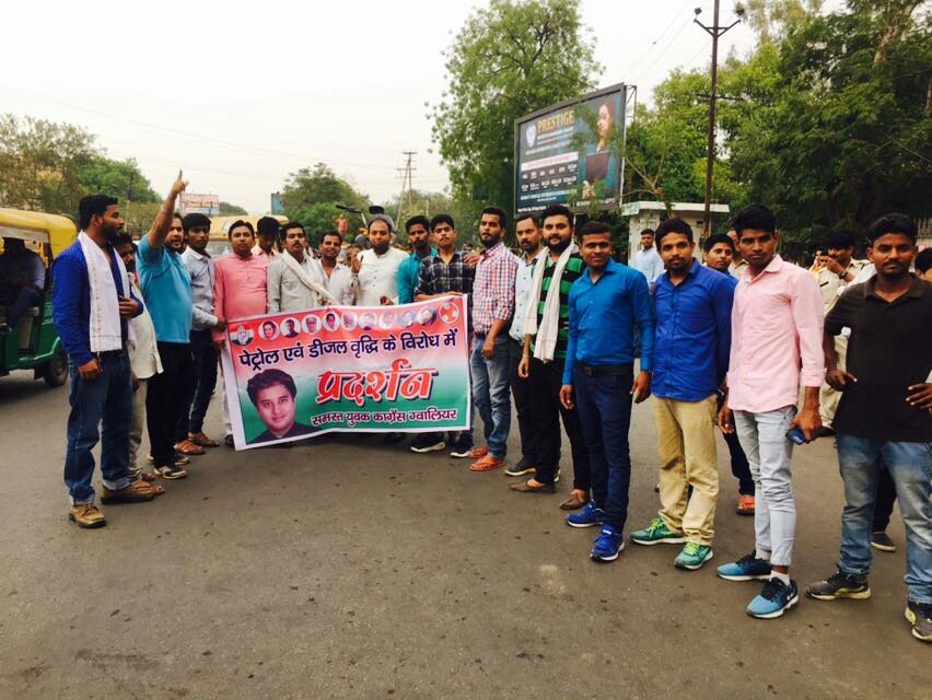 पेट्रोल एवं डीज़ल के लगातार बढ़ते दाम के विरोध में बुधवार 23 मई 2018 को युवक कांग्रेस महासचिव जिला ग्वालियर नितिन भदकरिया के नेतृत्व में फूलबाग चोराहै पर विरोध प्रदर्शन किया गया।