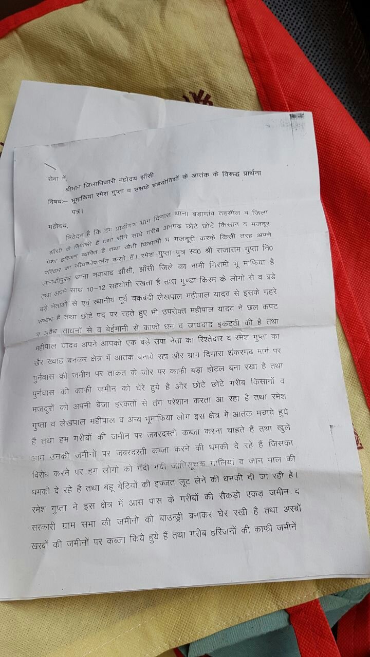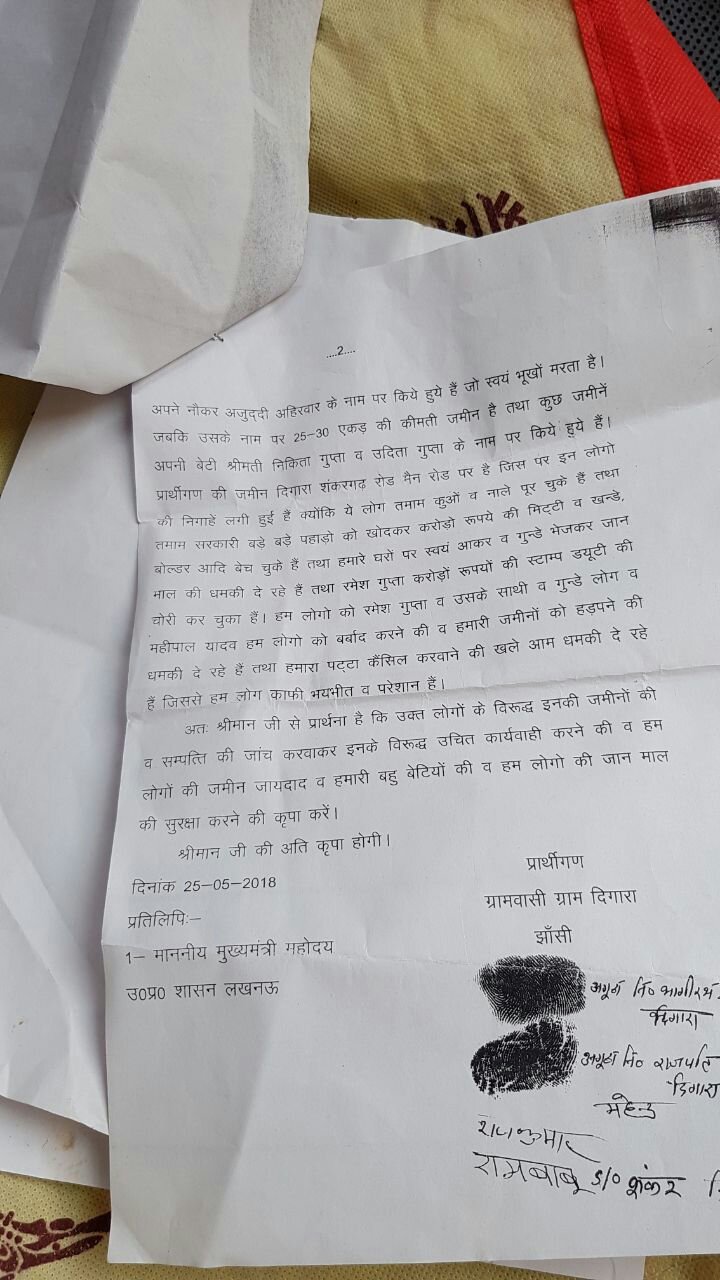 पीड़ित भागीरथ जिनके परिवार में कुल 06 लोग हैं का कहना है कि अगर मुझको न्याय नही मिला तो मैं अपने परिवार सहित आत्महत्या कर लूंगा और इस घटना के ज़िम्मेदार वतर्मान झाँसी पुलिस के अधिकारी एवं वर्तमान सरकार होगी। भागीरथ एवं महेंद्र चरन का कहना है कि आए दिन बन्दूक धारी रात में आते हैं और उनका कहना होता है अपनी कार्यवाही ख़त्म कर दो वर्ना तुम्हारे घर में घुस कर तुमको मार दिया जाएगा जिससे भागीरथ का परिवार भयभीत है।