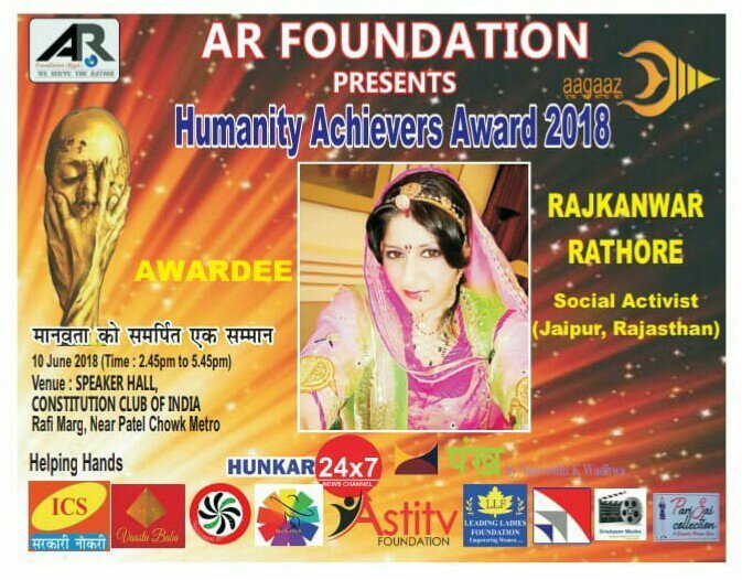 समाज सेवा एवं विभिन्न क्षेत्रों में अग्रणी रूप से अपनी प्रतिभा का लोहा मनवाने वाली 50 प्रतिभाओं को ए आर फॉउंडेशन द्वारा हर वर्ष ह्यमुनेटी अवॉर्ड से सम्मानित किया जाता है। इस साल दिल्ली में 10 जून 2018 को संवैधानिक क्लब ऑफ़ इंडिया में आयोजित होने वाले भव्य समारोह में राजस्थान जयपुर से वरिष्ठ समाज सेवी, सेवा भाव से ओतप्रोत व्यक्तित्व की धनी श्रीमती राज कवंर राठौड़ “राज बाईसा” को देश प्रदेश की 50 प्रतिभाओं के साथ ह्यमुनेटी अचीवर्स अवॉर्ड 2018 से नवाजा जायेगा।