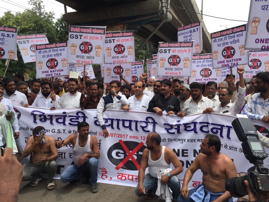 उल्लेखनीय कि कपडे पर लगाये गए जी एस टी से नाराज कपड़ा व्यापारियों ने पूरे देश में जीएसटी को हटाने की मांग करते हुए आन्दोलन शुरू किया है। पडोसी राज्य गुजरात के सूरत और अहमदाबाद में दो पखवाड़े से चल रही जीएसटी विरोधी आन्दोलन की आग भिवंडी तक पहुंच गई है। देर से ही सही भिवंडी के कपड़ा व्यापारी व पावरलूम मालिकों को होश आया और उन्होंने बीते 10 जुलाई को बैठक कर 15 जुलाई तक पांच दिन तक भिवंडी पावरलूम बंद की घोषणा की है। जी एस टी के विरोध में गुरुवार को दोपहर 12 बजे भिवंडी कपड़ा व्यापारी संगठन से जुड़े व्यापारियों तथा उद्योगपतियों ने एकता पावरलूम वेलफेयर एसोसिएशन के अध्यक्ष शोएब गुड्डू के नेतृत्व में प्रांत कार्यालय तक विशाल मोर्चा निकाल कर प्रान्त अधिकारी डॉ संतोष थिटे को ज्ञापन सौंपा। मोर्चे में कांग्रेस जिलाध्यक्ष शोएब गुड्डू के साथ शिवसेना विधायक रुपेश म्हात्रे, भिवंडी बुनकर समाज के अध्यक्ष हबीब अंसारी, राजस्थान ग्रे क्लॉथ अध्यक्ष सुरेन्द्र चोपड़ा, अरुण चौहान, नगरसेवक अरुण राउत, हनीफ बाबा, लतीफ़ मामा, इस्तियाक अंसारी, बबलू अंसारी सहित सैकड़ों पॉवरलूम मालिक व कपड़ा व्यापारी शामिल थे। मोर्चे में शामिल लोग जी एस टी को हटाना है, कपड़ा उद्योग बचाना है, अरुण जेटली मुर्दाबाद, नरेंद्र मोदी हाय हाय के नारे लगा रहे थे।