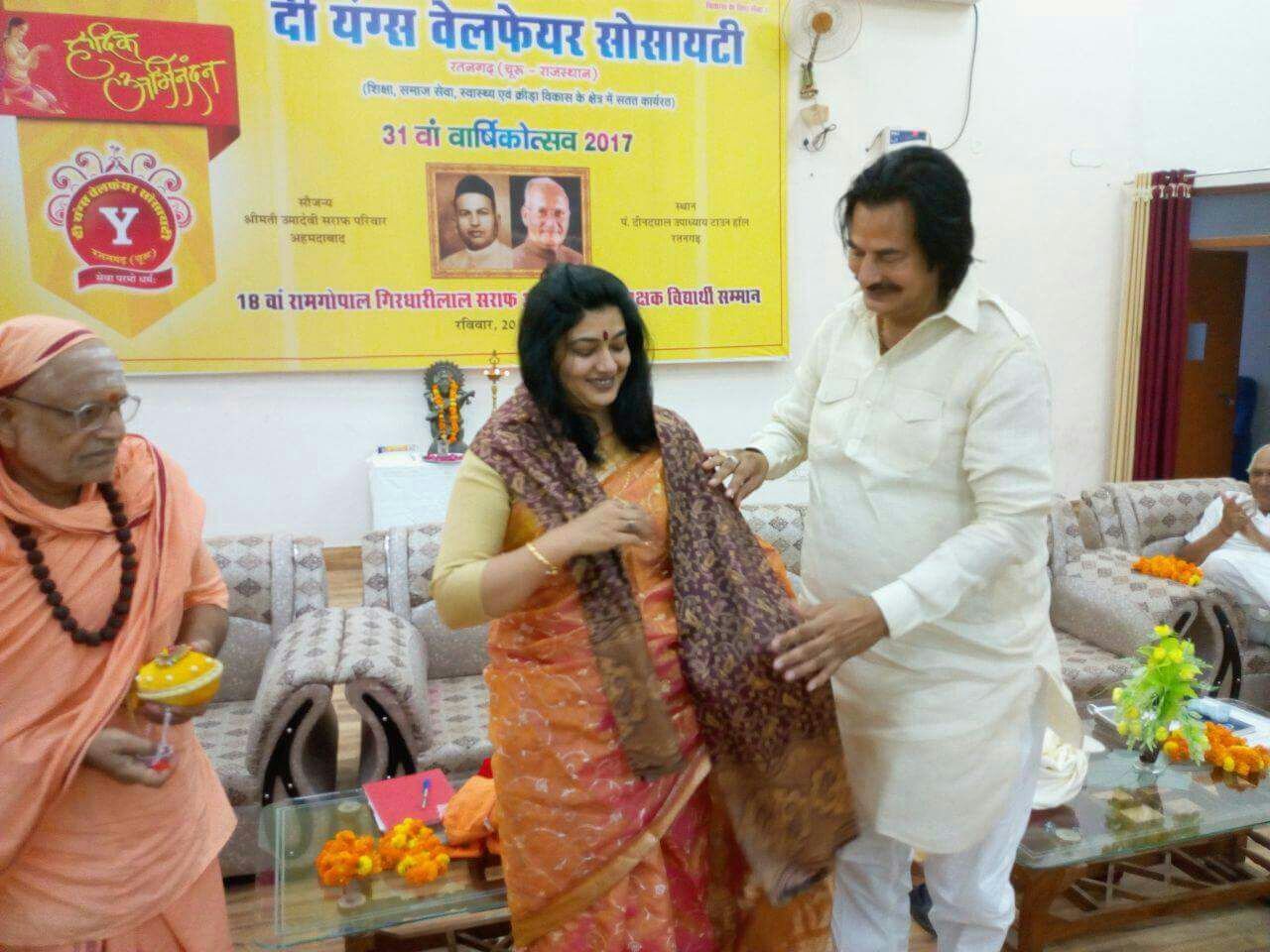 बीकानेर की वरिष्ठ साहित्यकार डॉ.मेघना शर्मा सर्राफ साहित्य अलंकरण से हुई सम्मानित, संवेदना स्पंदन आम आदमी तक पहुंचाना साहित्यकार का दायित्व है: डॉ. मेघना शर्मा | New India Timesकार्यक्रम अध्यक्ष संवित सोमगिरि जी महाराज शिवबाड़ी ने यत्र नार्यस्तु पूज्यन्ते की परिकल्पना से लेकर यज्ञचक्र में चल रहे सौरमंडल तक कई विषयों को समेट अपने उद्बोधन को विस्तार दिया। मुख्य अतिथि देवस्थान विभाग मंत्री राजकुमार रिणवां ने संस्कृति व मातृभाषा के महत्व को प्रतिपादित करते हुए जडों से जुड़े रहने पर बल दिया। स्वागत भाषण अहमदाबाद के उमा देवी सर्राफ परिवार के विवेक सर्राफ ने दिया और चीन के उत्पादों के बहिष्कार का पुरज़ोर आह्वान किया। इसी मंच से समाज सेवा के लिए मंत्री राजकुमार रिणवां व शिक्षा के क्षेत्र में शहर के विद्यालयों के सौ प्रतिशत परिणाम देने वाले शिक्षकों को भी सम्मानित किया गया। समारोह का संयोजन राकेश गहलोत ने किया। विशिष्ट अतिथि उपखंड अधिकारी ओमप्रकाश शर्मा ने भी मंच से संबोधित किया व महिला शिक्षा की पैरवी की। इसी समारोह में रतनगढ़ की अग्रवाल समिति द्वारा भी डॉ.मेघना को साहित्य साधना हेतु शॉल व स्मृति चिह्न देकर सम्मानित किया गया। डॉ मेघना शर्मा के सम्मानित होने पर बीकानेर के साहित्य जगत के साथ समाज सेवी संगठनों ने बधाई दी।