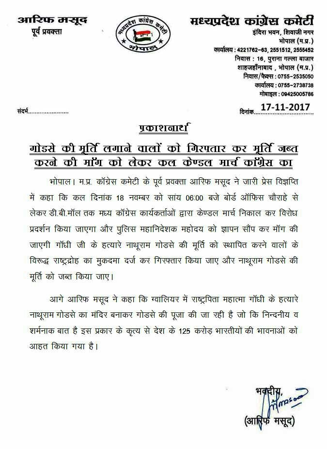 म.प्र कांग्रेस कमिटी के पूर्व प्रवक्ता आरिफ मसूद ने जारी प्रेस विज्ञप्ति में कहा है कि कल दिनांक 18 नवम्बर को सायं 06:00 बजे बोर्ड आफ़िस चौराहे से लेकर डी.बी मॉल तक मध्य कांग्रेस कार्यकर्ताओं द्वारा विरोध प्रदर्शन किया जायेगा और पुलिस महानिदेशक महोदय को ज्ञापन सौंप कर मांग की जायेगी कि गांधी जी के हत्यारे नाथूराम गोडसे की मूर्ती को स्थापित करने वालों के विरुद्ध राष्ट्रद्रोह का मुकदमा दर्ज कर गिरिफ्तार किया जाये और नाथू राम गोडसे की मूर्ती को ज़ब्त किया जाये। आगे आरिफ मसूद ने कहा की ग्वालियर में राष्ट्रपिता महात्मा गांधी के हत्यारे नाथूराम गोडसे का मंदिर बना कर गोडसे की पूजा की जा रही है जो कि निन्दनीय व शर्मनाक बात है, इस प्रकार के कृत्य से देश के 125 करोड़ भारतीयों की भावनाओं को आहत किया गया है।