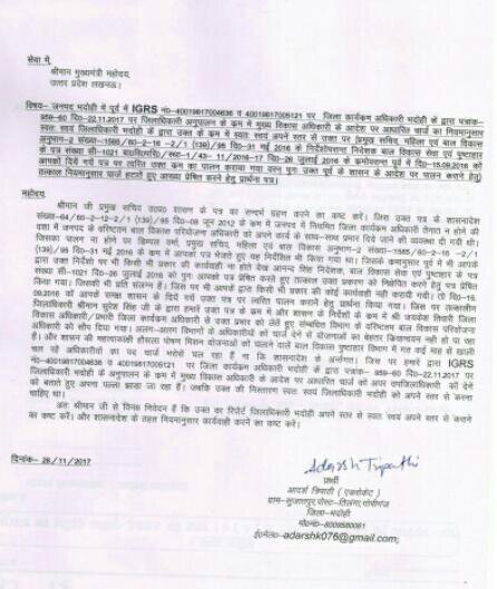 पूर्व में प्रमुख सचिव ने 31 मई 2016 को आदेश जारी किया था कि जिन जिलों में जिला कार्यक्रम अधिकारी ना हो तो वहाँ का चार्ज सम्बन्धित विभाग के वरिष्ठ बाल विकास परियोजना अधिकारी को दिया जाए। पूर्व की भांति दो माह बीत जाने के उपरांत पुनः शासन के आदेशों को प्रभावी बनाने से रोका जा रहा है। इससे सरकार की कल्याणकारी योजनाओं का बेहतर क्रियान्वयन नहीं हो पा रहा है। जिस पर त्रिपाठी के द्वारा की गई शिकायत पर जिलाधिकारी व मुख्य विकास अधिकारी के आदेशों की दुहाई देते हुए शिकायती पत्र से पल्ला झाड् लिया गया है।