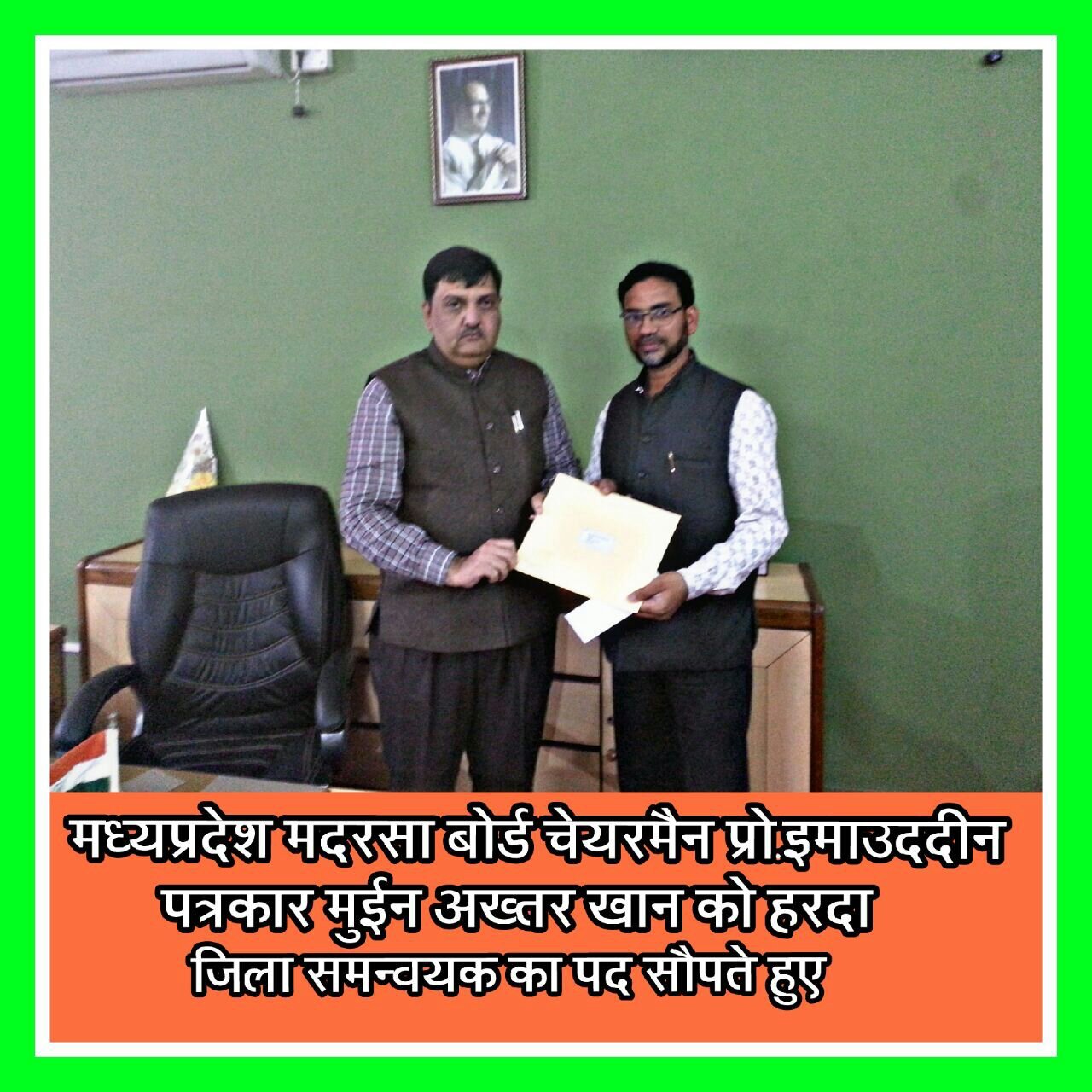 मध्यप्रदेश मदरसा बोर्ड अध्यक्ष प्रो.सैय्यद इमाउददीन ने पूर्व राजस्व मंत्री कमल पटेल, नपा अध्यक्ष सुरेंद्र जैन ,भाजपा जिलाध्यक्ष अमर सिंह मीना की सहमति से जनाब मोइन अख्तर खान को ज़िला हरदा मध्यप्रदेश मदरसा बोर्ड म.प्र. शासन का जिला समन्वयक नियुक्त किया है।