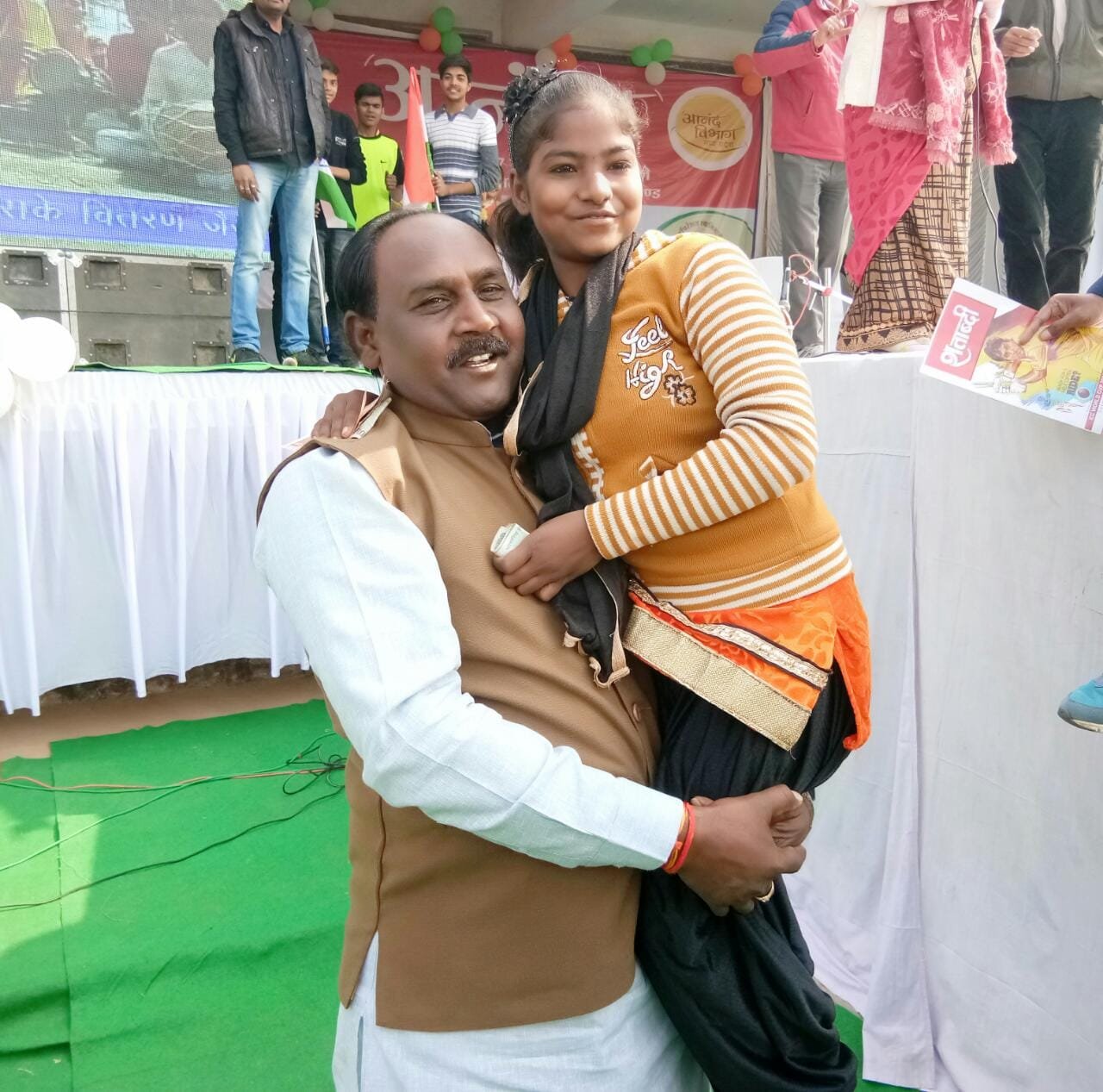 पवन सोनी, भिंड ( मध्यप्रदेश ), NIT; ​कक्षा 9 की छात्रा दिव्या के गायन पर झूमा पंडाल | New India Timesनगर के राजीव गांधी स्पोर्ट्स स्टेडियम में आयोजित आनंद महोत्सव के दौरान एक छात्रा दिव्या शाक्य की आवाज पर झूमे मंत्री लाल सिंह आर्य, श्री आर्य ने गायन के बाद दौड़कर बच्ची को गोद में उठाकर दुलार किया, साथ ही नगरपालिका अध्यक्ष कलावती मिहोलिया ने भी गालों पर पप्पी लेकर दुलार किया। गायन के बीच में मंत्री लाल सिंह आर्य और कई दर्शकों ने दिव्या को 100 और 500-500 के नोट भी भेंट किए। नोटों से दिव्या का पूरा हाथ भर गया। दिव्या ने ‘एक बार तू आजा सांवरिया, राधा ये रो रो कहे गाया तो मंत्री लाल सिंह आर्य, विधायक नरेंद्र सिंह और  कलेक्टर इलैया राजा टी, एसपी अनिल सिंह कुशवाह, सीईओ प्रवीण सिंह, एएसपी अमृत मीणा, एसडीएम संतोष तिवारी सहित स्टेडियम में मौजूद सभी दर्शक आनंदित होकर झूमे उठे।