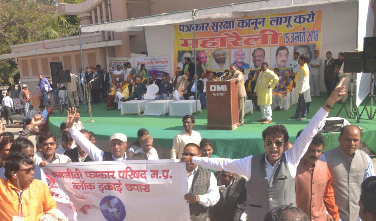 भोपाल के रविंद्र भवन में प्रदेश भर से हजारों पत्रकारों ने सम्मेलन के उपरांत महा रैली निकाली और अपनी मांगों को लेकर गगन भेदी नारेबाजी करते हुए जनसंपर्क मुख्यालय के सामने धरने पर बैठ गए और रोड पर ही भोजन किया। इसी दौरान प्रदेश के मुखिया शिवराज सिंह चौहान ने संगठन के पदाधिकारियों से दूरभाष पर चर्चा कर 1 सप्ताह के अंदर जनसंपर्क विभाग के अधिकारियों एवं पदाधिकारियों के साथ बैठकर उचित मांगों के निराकरण की बात कही तब सभी पत्रकारों ने अपनी जायज़ मांगों का ज्ञापन जनसंपर्क विभाग के अधिकारी को सौंपा।​पत्रकार महाकुंभ में 16 संगठन हुए एकजुट, बना संयुक्त पत्रकार महासंघ | New India Timesज्ञात हो कि प्रदेश भर से उपस्थित पत्रकारों के महाकुंभ में एकत्र हुए हजारों पत्रकारों की इस महारैली ने पत्रकारों के संगठन संचालित कर रहे उन नेताओं की भी पोल खोल दी जो बड़ी बड़ी बातें तो करते हैं पर भोपाल में शक्ति प्रर्दशन करने की बात पर किनारा काट गए आखिर किनारा कयों न काटते, जब उनके संगठनों में पत्रकार सदस्य ही नहीं है।