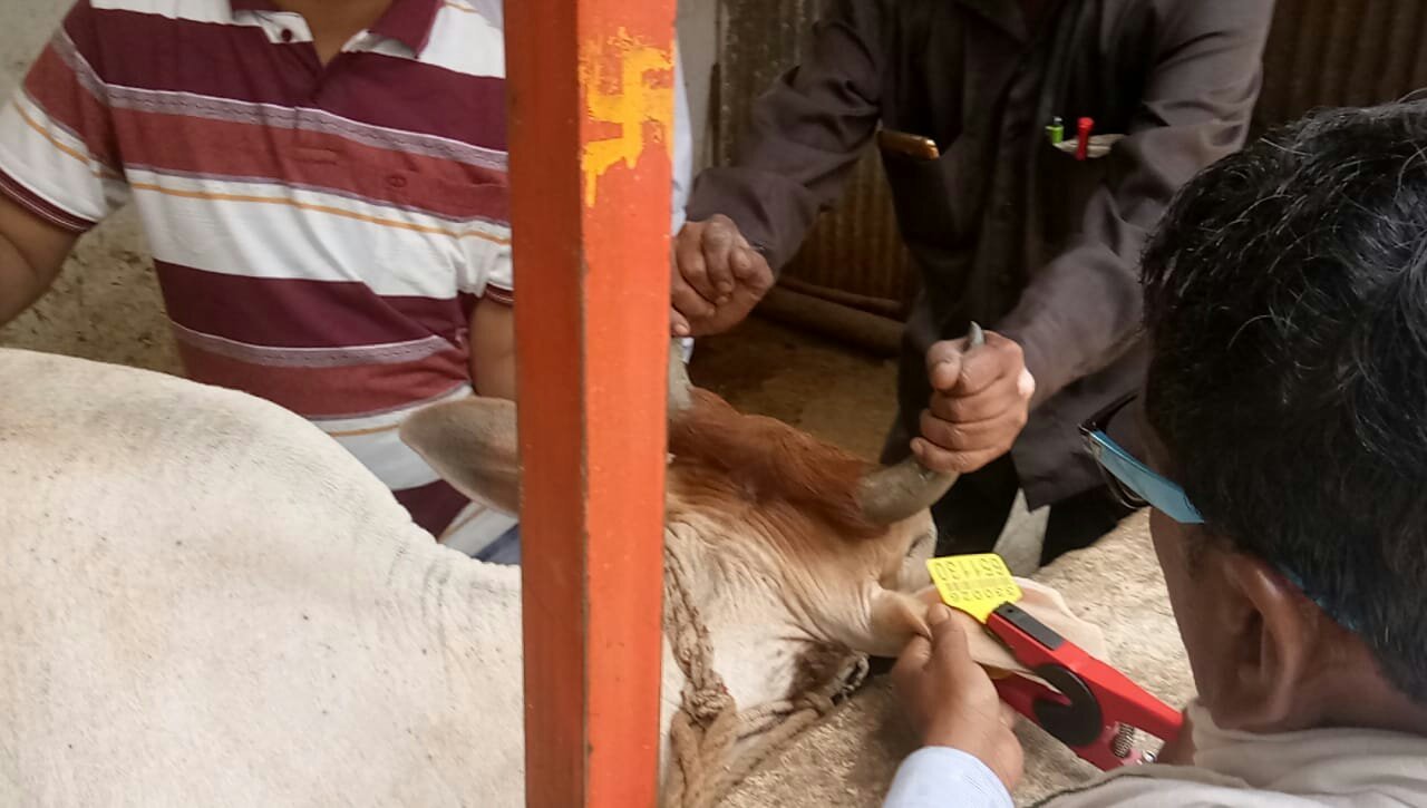 भोपाल जिला पशुचिकित्सालय के सहायक पशु चिकित्सा क्षेत्र अधिकारी श्री जे.पी. गौर एवं उनकी टीम द्वारा राजधानी भोपाल की मां हिंगलाज गौशाला में पहुंचकर केन्द्र सरकार की योजनांतर्गत दुधारू एवं प्रजनन योग्य गायों को पहचान करने के उद्देश्य से टेंगिंग की गई।
