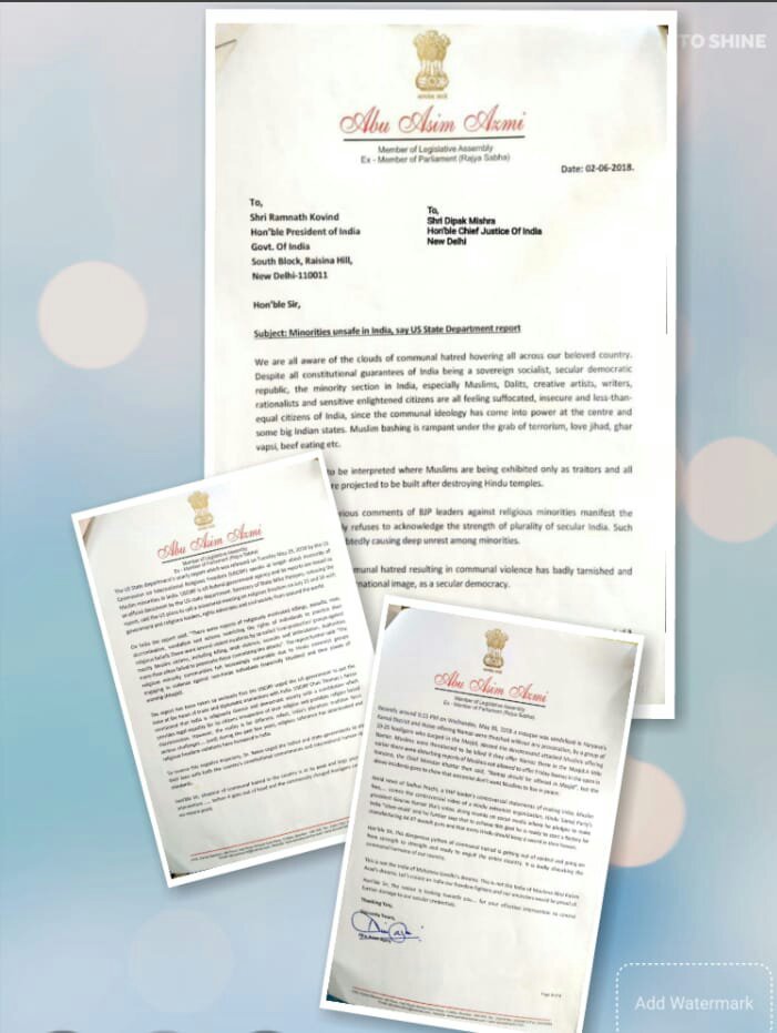 आजमी ने रिपोर्ट का हवाला देते हुए बताया कि ३० मई को हरियाणा में नमाज अदा कर रहे मुस्लिम समुदाय के लोगों पर हमला किया गया और नमाज में बाधा पहुंचाई गई। उन्हें जान से मारने की धमकी दी गई। इसके बाद राज्य में मुख्यमंत्री मनोहरलाल खट्टर ने कहा कि मुस्लिम समाज के लोगों को सिर्फ और सिर्फ मस्जिदों में नमाज पढ़ना चाहिए। इसी तरह विश्व हिन्दू परिषद की नेता साध्वी प्राची और गौरव कुमार झा का विवादित विडिओ आया है जिसमें भारत को मुस्लिम मुक्त किये जाने का दावा किया गया है। आजमी ने राष्ट्रपति से अपील की है कि उक्त रिपोर्ट की पृष्भूमि में हस्तक्षेप करें और देश के सांप्रदायिक ढांचे को ध्वस्त होने से बचायें। आजमी ने पत्र में कहा है देश का संविधान धार्मिक आजादी देता है। इसकी हर हाल में रक्षा होनी चाहिए। यह देश महात्मा गाँधी और मौलाना अब्दुल कलाम आजाद के सपनों का देश है। इसे बनाये रखने के लिए पूरा देश आपकी (राष्ट्रपति ) तरफ देख रहा है। ऐसे में आजमी ने राष्ट्रपति और सुप्रीम कोर्ट के मुख्य न्यायाधीश से अपील की है कि देश की धर्मनिरपेक्षता को बनाये और बचाये रखने के लिए हस्तक्षेप करें।