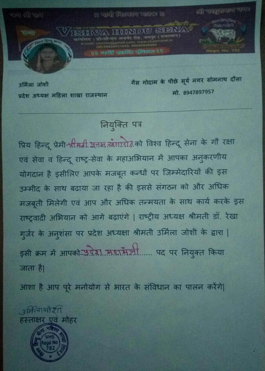 विश्व हिंदू सेना की राष्ट्रीय अध्यक्षा श्रीमती डॉ रेखा गुज्जर की अनुसंशा पर राजस्थान प्रदेश अध्यक्षा श्रीमती उर्मिला जोशी ने प्रदेश टीम का विस्तार करते हुए समाज सेवा कार्यो में सक्रिय सोशल एक्टिविस्ट श्रीमती पूनम खंगारोत को विश्व हिंदू सेना में प्रदेश महा मंत्री की जिमेवारी सुपुर्द कर धर्म ध्वजा को आगे बढ़ाने के निर्देश दिए हैं।