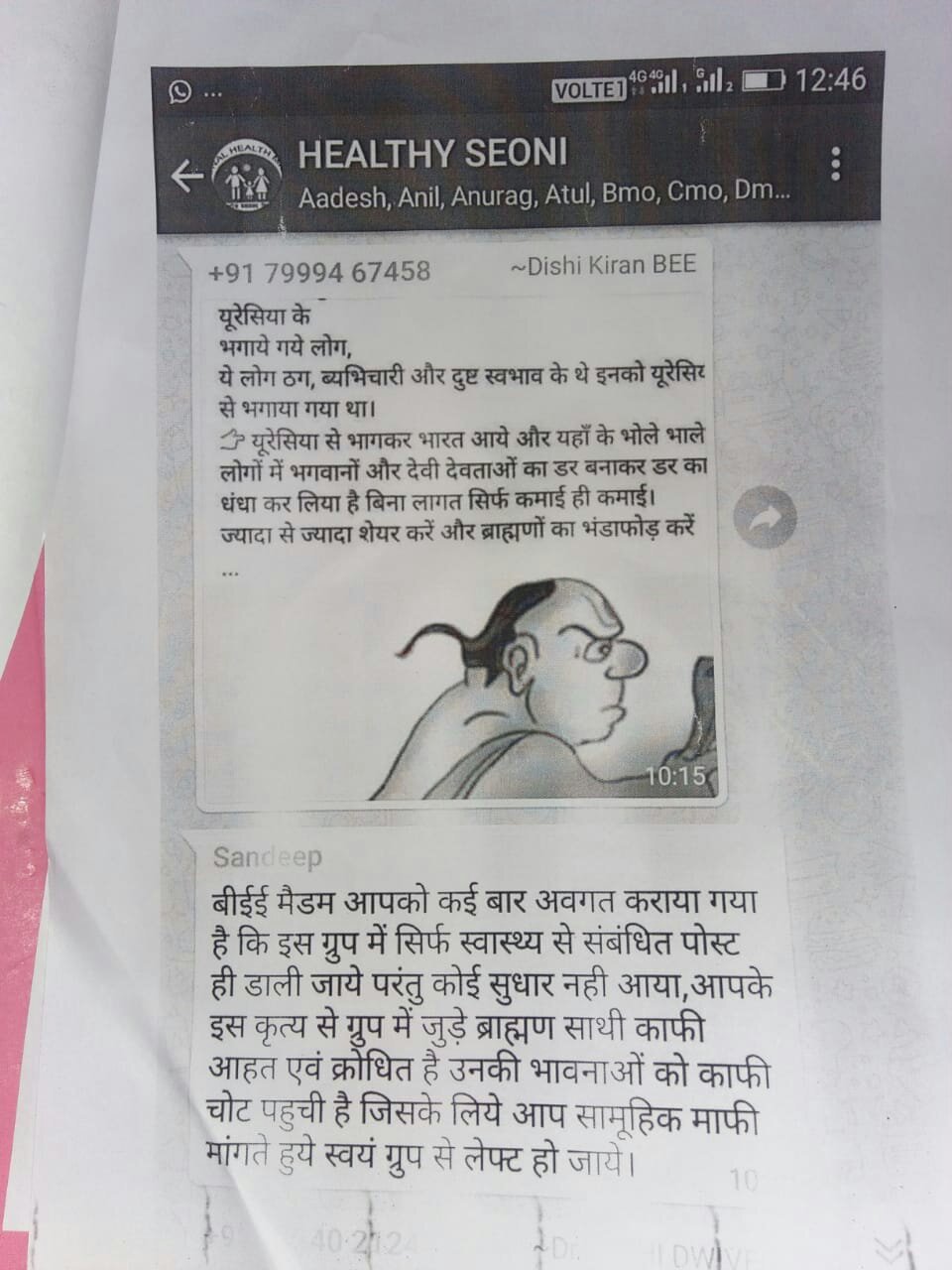 सिवनी जिले की घंसौर तहसील के सामुदायिक स्वस्थ केंद्र में पदस्थ (पोस्ट B, E ,E ) किरण गजभिये के द्वारा वाट्सएप ग्रुप हेल्थ सिवनी में ब्राह्मण समाज पर अभद्रता पूर्वक टिप्पणी की गई है जिससे ब्राह्मण समाज इस टिप्पणी से बहुत ही आहत हुआ है। इस की जानकारी जब जिले के स्थानीय संगठन एवं अंतर्राष्ट्रीय ब्राह्मण महासंस्था के पदाधिकारियों को लगी तो इसे गंभीरतापूर्वक लेकर समाजिक बैठक की, बैठक में निर्णय लिया गया कि यह बहुत ही गलत कृत्य है इसलिए इस पर ठोस कदम उठाया जाये। तत्पश्चात सिवनी कोतवाली, लखनादौन एवं घंसौर थाने में ब्राह्मण समाज के लोगों ने लिखित रूप से शिकायत कर कार्रवाई की मांग की।