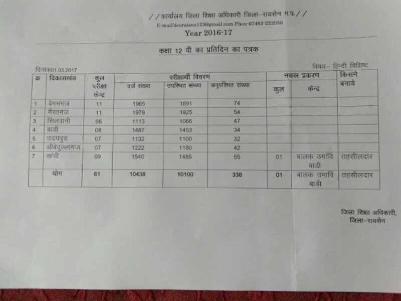 बुधवार को रायसेन जिले में 12वीं के बोर्ड परीक्षा का पहला प्रश्न पत्र हिन्दी विशिष्ट का जिले में शांति पूर्ण तरीके से सम्पन्न हुई, वहीं जिले में नकल के 2 प्रकरण सामने आए।