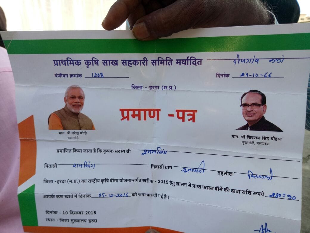 मिली जानकारी के अनुसारसिराली तहसील के ग्राम जूनापानी के किसान पूनम मीना को 8 एकड़ जमीन का फसल बीमा 280.90 रुपये मिल है। किसान का कहना है कि इस राशि से पेट्रोल का खर्चा भी नहीं निकलेगा।। इसी मामले को लेकर हरदा विधायक आर के दोगने ने कहा कि 8 एकड़ जमीन का फसल बीमा 280 रुपए मिला है, ऐसी स्थिति है। सरकार कोई भीख नहीं दे रही है। यह किसानों का अपमान है।किसान ने कहा कि सर्टिफिकेट भी हमारे पास है । हम प्रीमियम भी कटवाते हैं। हम कोई भीख नहीं ले रहे हैं । सरकार द्वारा हमारा अपमान किया जा रहा है । वहीं दूसरा मामला हरदा जिले के सिराली तहसील के ग्राम दीपगांव कला के पटवारी हल्का 23 के किसी भी किसान को बीमा राशि का लाभ नही मिला है।