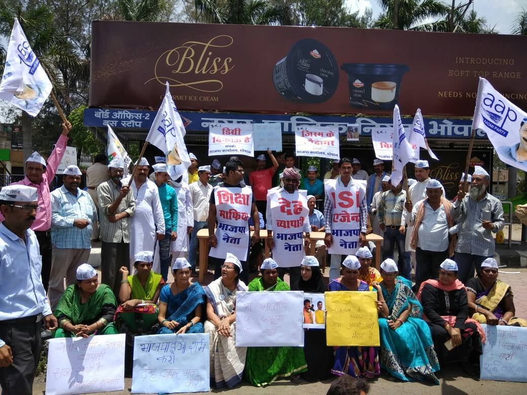 देह व्यापारी भाजपा नेता, आई एस आई एजेंट भाजपा नेता व शिक्षा माफिया भाजपा नेता का ह्यूमन बैनर पहनकर आप कार्यकर्ताओ ने भाजपा नेताओ के असली धंधों की दुकान लगाई। तीनो दुकानों के ऊपर पोस्टर भी लगाए गए जिनमें लिखा था:-