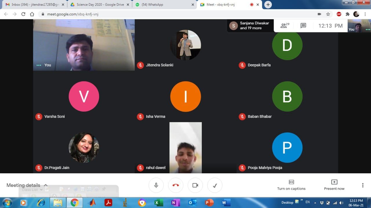 उन्होंने कई मॉडल उसी समय बनाकर बच्चों को उसके पीछे का विज्ञान समझाया द्वितीय व्याख्यान डॉक्टर बसंत सोनी विभाग अध्यक्ष प्राणीशास्त्र पंडित जवाहरलाल नेहरू शासकीय मनावर विद्यालय नेपानगर द्वारा व्याख्यान दिया गया उनके द्वारा व्याख्यान में विज्ञान में भविष्य तलाशने के कई विस्तृत विवरण दिए गए उन्होंने विज्ञान के बारे में और दैनिक जीवन में विज्ञान के महत्व को समझाया और इस प्रोग्राम के साथ ही विज्ञान पर आधारित ऑनलाइन क्विज का कार्यक्रम आयोजित किया गया द्वितीय दिवस पोस्टर प्रेजेंटेशन, निबंध लेखन विषय कोविड-19 के सकारात्मक एवं नकारात्मक प्रभाव पर, पोस्टर विषय कोविड-19 के कारण दैनिक जीवन और पर्यावरण पर प्रभाव एवं वर्किंग मॉडल विषय पर चलित मॉडल का दैनिक जीवन में उपयोग का कार्यक्रम आयोजन किया गया इस कार्यक्रम में 150 से अधिक प्रतिभागी ने विभिन्न प्रतियोगिताओं में हिस्सा लिया कार्यक्रम के मुख्य संरक्षक डॉ सुरेश सिलावट जी अतिरिक्त संचालक इंदौर संभाग एवं प्राचार्य शासकीय महाविद्यालय होलकर विज्ञान महाविद्यालय इंदौर मुख्य अतिथि श्री प्रजातंत्र गंगेले प्रांतीय अध्यक्ष विज्ञान भारती महाविद्यालय के प्राचार्य और संरक्षक आदरणीय डॉ आर सी पांटेल सर आइक्यूएसी प्रभारी डॉ आई एस सस्तिया डॉक्टर के एस वास्केल, सीनियर्स एवं महाविद्यालय परिवार के समस्त प्रोफ़ेसर उपस्थित रहे। कार्यक्रम का आरंभ प्राचार्य डॉ आई एस सस्तिया के संबोधन से आरंभ किया गया कार्यक्रम का संचालन संयोजक डॉक्टर जितेंद्र सोलंकी एवं डॉ प्रगति जैन द्वारा किया गया रिसोर्स पर्सन का बायोडाटा प्रोफ़ेसर ममता भायल द्वारा दिया गया क्विज का आयोजन डॉक्टर अंकिता सोनी द्वारा, चलित मॉडल का आयोजन डॉक्टर अनीता शर्मा, पोस्टर डॉ मनोज पाटीदार, निबंध प्रतियोगिता का आयोजन प्रोफेसर रितु मथुरिया एवं प्रोफेसर प्रीतिका पाटीदार द्वारा किया गया सीवी रमण की बायोग्राफी डॉ अनीता शर्मा द्वारा पढ़ी गई डॉक्यूमेंट्री का संचालन प्रोफेसर अजय सोलंकी द्वारा किया गया कार्यक्रम का आभार कार्यक्रम के संयोजक डॉ नूतन राजपूत द्वारा दिया गया।