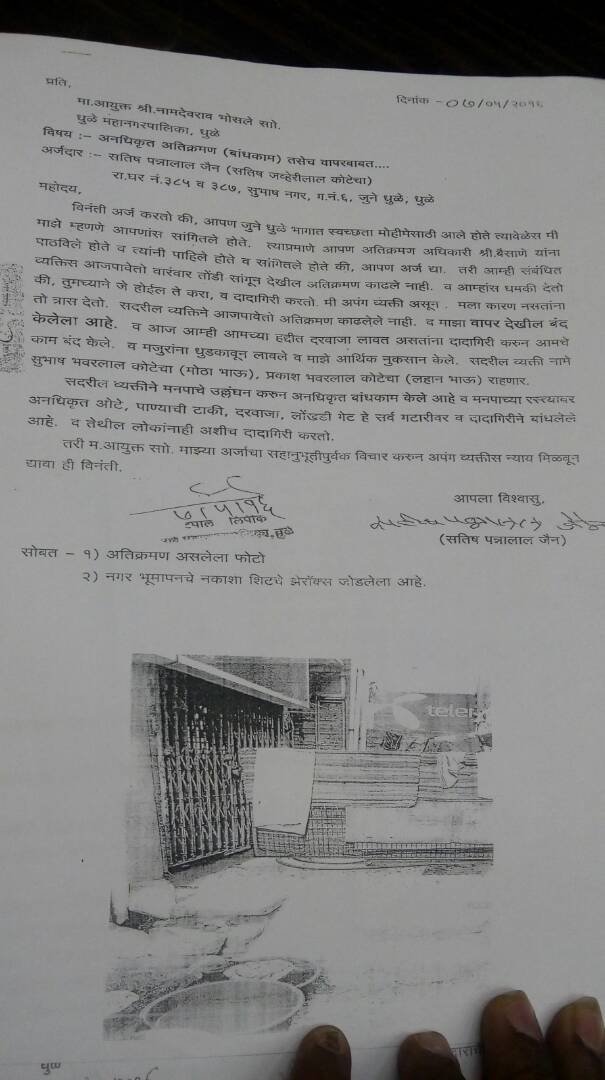 सुभाष नगर निवासी संतोष पन्नालाल जैन घर क्रमाक 385 एवं 387 उनके घर के सामने की जमीन पर उन्हें दरवाजा लगाना है। उन्हीं के घर के सामने के व्यक्ति सुभाष भंवर लाल कोटेचा तथा उसका भाई प्रकाश भंवरलाल कोटेचा ने दबंगई करते हुए मनपा की सरकारी भूमि पर अतिक्रमण कर कब्जा किया है। उसी तरह दिव्यांग संतोष पन्नालाल के घर के सामने अतिक्रमण कर रखा है। उनकी जमीन पर उन्हें ही दरवाजा नही लगाने देता है। धौस दिखाता है बोलता है कि मनपा अतिक्रमण निर्मलन दस्ता उसकी जेब में है। नवनियुक्त आयुक्त से संतोष जैन ने अतिक्रमण हटाने की गुहार लगाई है तथा अतिक्रमण हटाने संबंधी गुमराह करने वाली रिपोर्ट पेश करने वाले अधिकारी के खिलाफ कारवाई करने की मांग है।