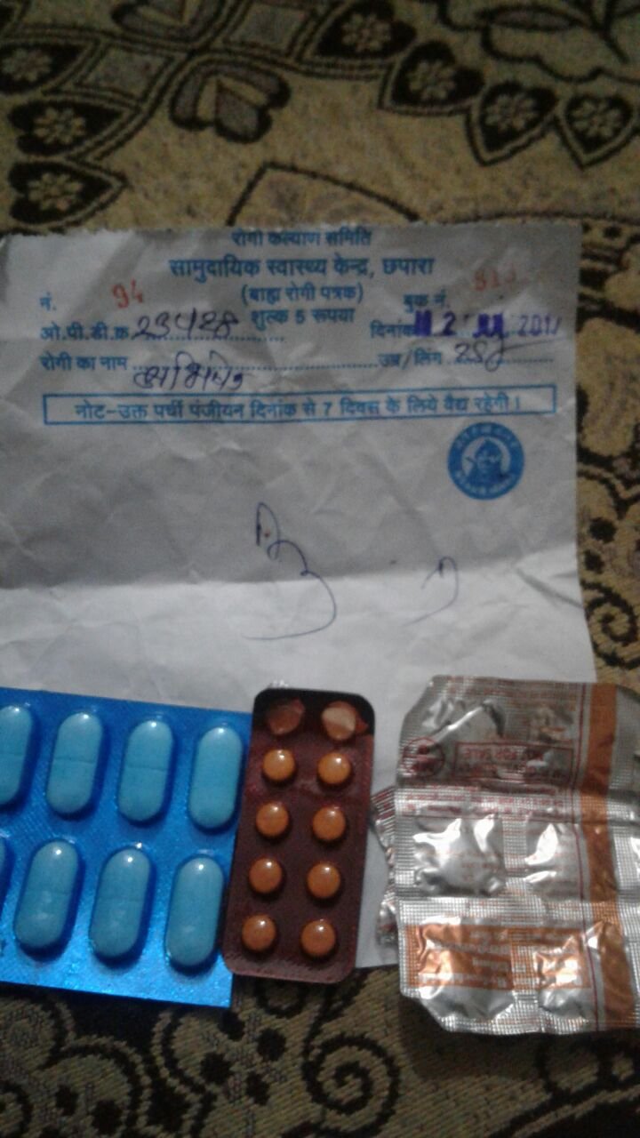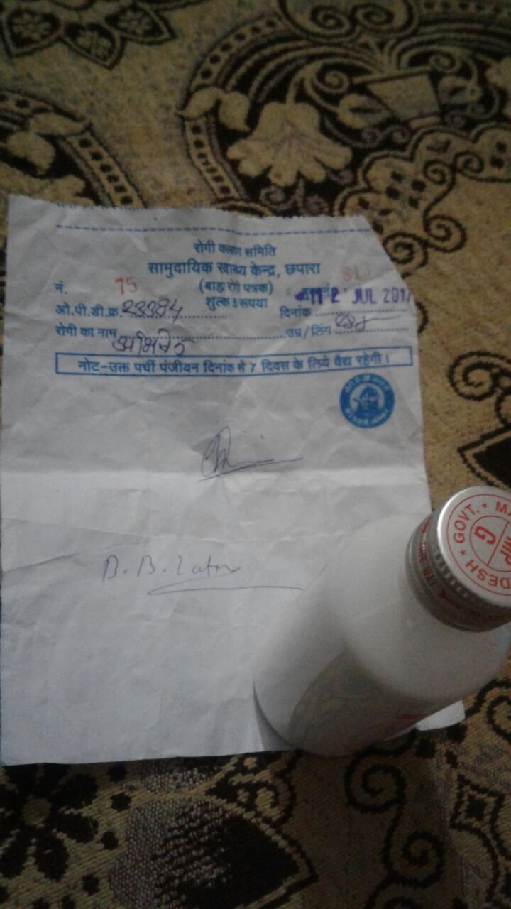 पं.अभिषेक तिवारी ने NIT संवाददाता को बताया कि उनके के हाथ पैर मे दर्द था। जिसके इलाज के लिए वह सामुदायिक स्वास्थ्य केन्द्र छपारा पहुंचकर पांच रूपये की रसीद कटवाया जिसका नम्बर २३३८४ है, डा.पीयूष जैन के पास पहुंचकर दिखाया तो डाॅ. द्वारा दो प्रकार की दबा लिख दी गयी। जब वह दवा लेने दवा कक्ष गये और दवा लिया तो दवा वितरक ने पूछा कि क्या हुआ है तो उसने बताया की मुझे हाथ पैर में दर्द है जिस पर दवा वितरक बोला ये दवा तो खुजली की है, फिर से डॉक्टर को दिखा लो।