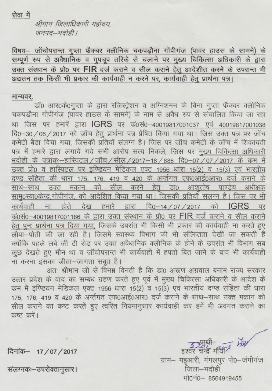 पतांक हॉस्पिटल /जाँच/सील/2017/18/ दिनांक 07/07/2017 के क्रम उक्त प्राइवेट हॉस्पिटल पर इंडियन मेडिकल एक्ट 1950 धारा 15(2)15(3) एवं भारतीय दन्ड सहिंता की धारा 175,176, 419, 420 के अंतर्गत FIR दर्ज़ करने के साथ मकान को भी सील कर दिया जाए। डाॅ आशुतोष पाण्डेय सामुदायिक स्वास्थ्य केंद्र गोपीगंज को आदेश किया गया पर कोई करवाई नहीं की गई। यह आदेश भदोही CMO का एक दिखावा बन के रह गया है।